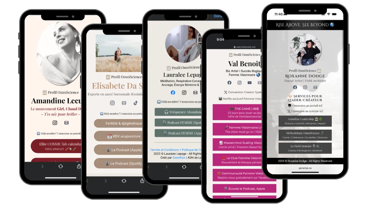 GeneRise inclut la création d’un Linktree personnalisé, aligné à ton énergie. Ce n’est pas une simple page de liens. C’est un portail de cohérence entre : ton identité, ton message, ce que tu offres au monde. Chaque structure, chaque mot, chaque entrée est pensée pour refléter qui tu es vraiment, pas une formule marketing copiée-collée. Ton espace digital devient lisible. Fluide. À ton image.